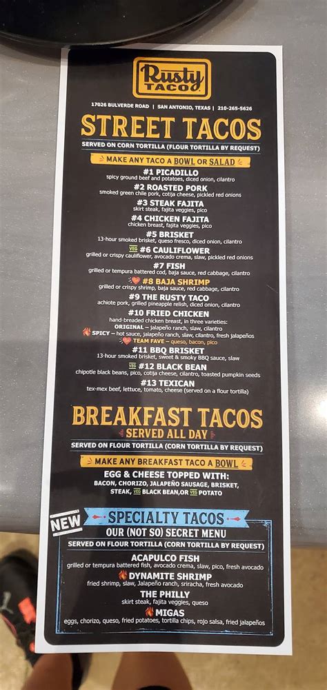 Web what better way to hang out with family and friends than at your neighborhood rusty taco? On tuesday, february 8 on the northside. Rusty taco has been open for a bit, but we hadn't tried it until tonight. Web rusty taco (17026 bulverde rd) 4.4 (46 ratings) • mexican • $. #2 roasted pork taco 170 calories smoked green chile pork, cotija cheese, pickled red onions. Breakfast offerings include egg and cheese tacos topped with proteins such as brisket, jalapeño sausage, bacon,. #3 beef fajita taco 210 calories skirt steak, fajita veggies, pico. Please enter your address to find a location near you. For us, it hit exactly the spot we needed: Open daily from 7 a.m.
