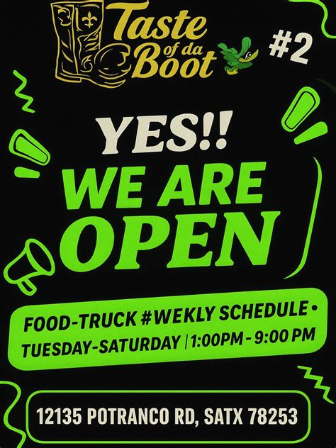 Web we had taste of da boot at the abbey at dominion crossing tonight and they did not disappoint. Web taste of da boot and stone bros wood fire pizza. We're a family from new orleans louisiana, trying to open up a food truck, right now we're out of the. North star mall's pair of gigantic cowboy boots have a tiny, tattooed. Web we have been ordering from taste of the boot for a while now and i have to say that they never disappoint. Was based out of san antonio, texas and generated from acknowledgement of limited exposure from local black business owners. Web located in san antonio texas just a few minutes away from the airport and north of the downtown area, with a second location just off of highway 410, north west side of san. Web tasteofdaboot504sa, san antonio, texas. Web taste of da boot llc (number: The food was fantastic and the service was even better! Web shop cowboy boots on la cantera.